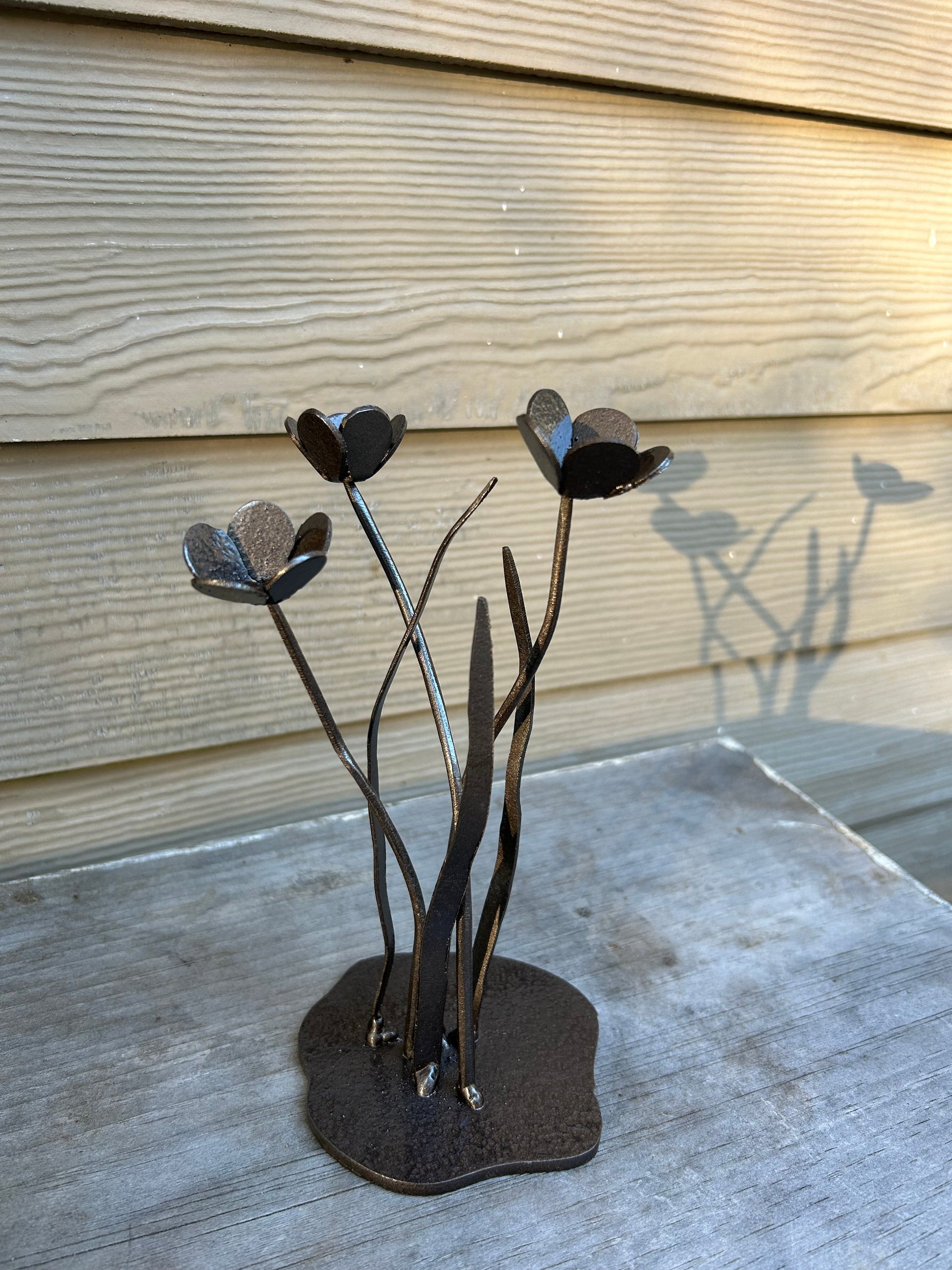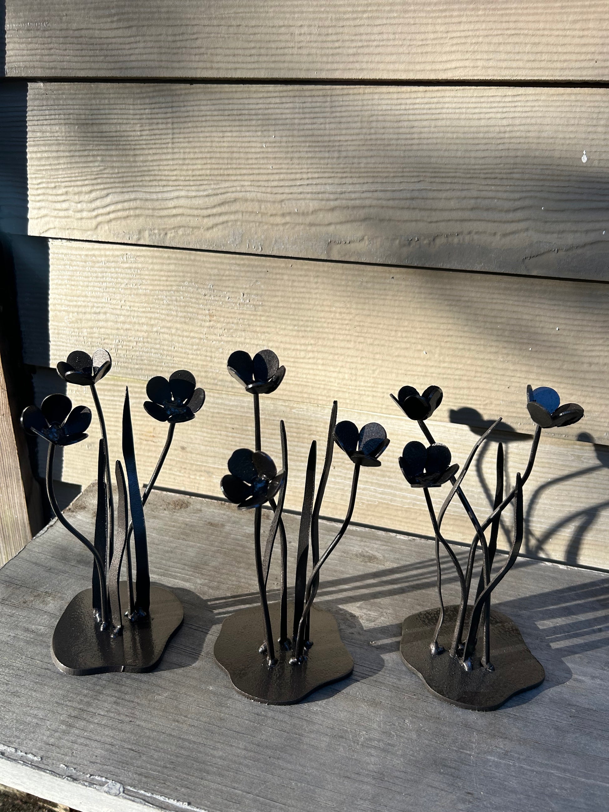 Buttercups in Consider The Wildflowers Collection sets 8”x3.5”, colored with burnished amber, three flowers with grass, handmade by me all out of scrap metal.